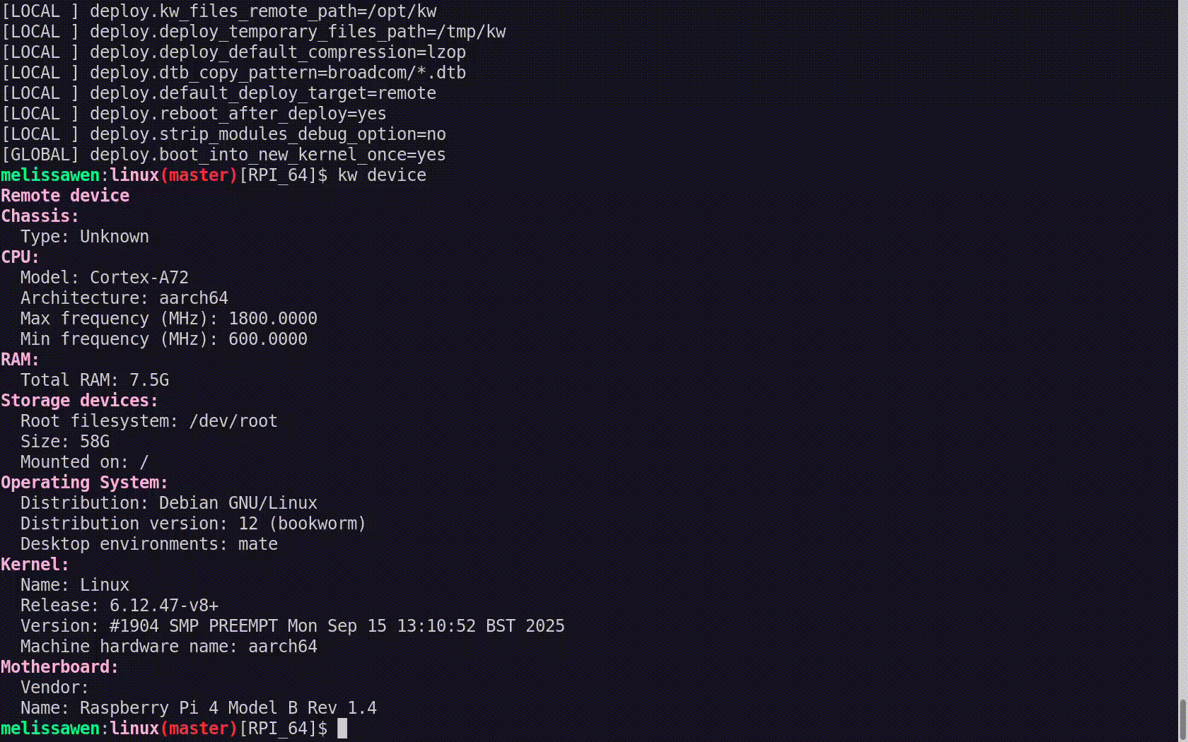 As I started the demo in the kw environment for Raspberry Pi 4, I first moved to another environment previously used for Steam Deck. In this STEAMDECK environment, the mainline kernel was already compiled and cached, and all settings for accessing the target machine, compiling and installing a custom kernel were retrieved automatically.